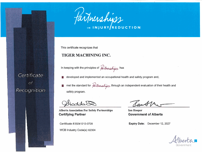 Tiger Machining prioritizes work environment safety, individual well-being for on-site and off-site employees, and upholds the highest operational standards, maintaining partnerships with leading industry certifications, including ISO 9001:2015, Partnerships in Injury Reduction, COR, and HSE. Moreover, our field personnel are trained in First Aid, H2S Alive, and PST, ensuring comprehensive preparedness for any situation.