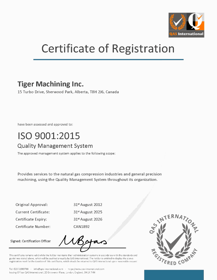 Tiger Machining prioritizes work environment safety, individual well-being for on-site and off-site employees, and upholds the highest operational standards, maintaining partnerships with leading industry certifications, including ISO 9001:2015, Partnerships in Injury Reduction, COR, and HSE. Moreover, our field personnel are trained in First Aid, H2S Alive, and PST, ensuring comprehensive preparedness for any situation.